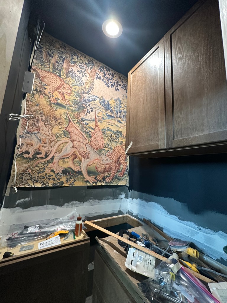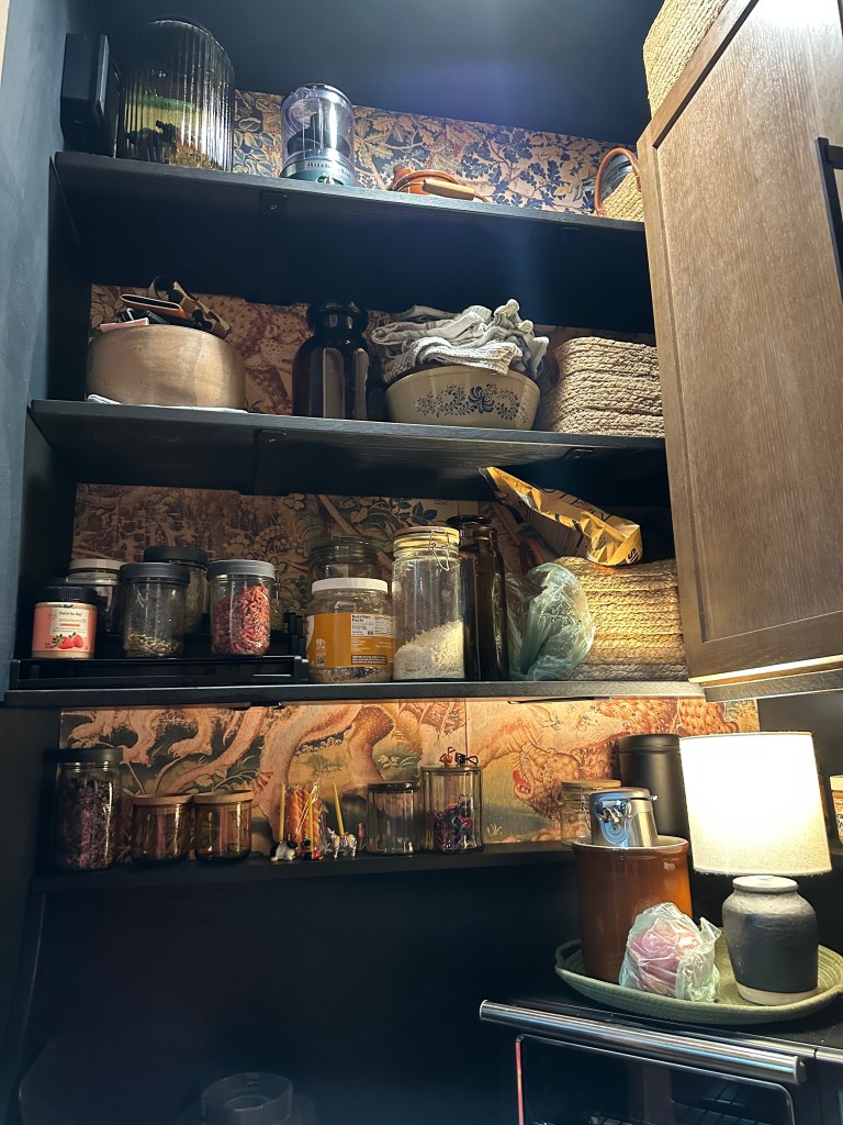 So I pivoted—and honestly, it worked out. I’d been eyeing this wallpaper from wallcolors that is a reprint of an old medieval tapestry and had no clue where to put it. The pantry wall behind the now shelves idea ended up being the perfect spot. It all came together in a totally unplanned, very “me” kind of way.