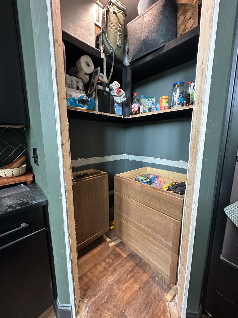 The next day, I tore everything out of the pantry to get ready for install along with the door frame. BYE BYE Door. I had ordered two lower cabinets and two uppers. Once they arrived and we started putting them in, we realized pretty quickly that the upper cabinets weren’t going to work in the space no matter how much I wanted them to.